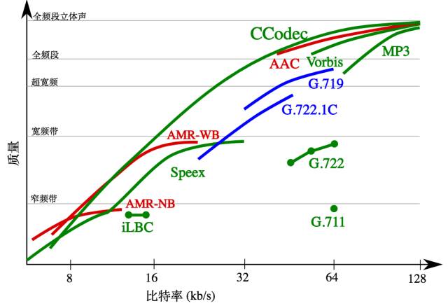 从比特率与质量的对比曲线中可以看出,CCodec编解码不仅在低比特时对音频的保真超越了iLBC、AMR-NB、Speex、AMR-WB,在高比特率的情况下,音质依然越超众多现有的编解码。