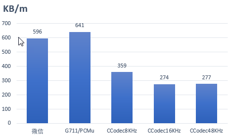 为了使用PhoneSDK适应移动场景下的音频传输,在音频压缩方面采用了有损压缩算法,在保证音质的前提下,大大降低了编码后的音频大小。在相同的网络环境下,使用相同的设备进行测试,在使用CCodec 48KHz采样率的情况下,编码的音频仅为微信的1/2,是传统G711/PCMu的1/3左右。